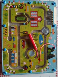 gioco di legno, palline calamitate e penna a calamita, per portare le palline lungo in percorso. sviluppa la vista e l'ingegno . la plastica protettiva è segnata, immancabilmente in quanto la calamita deve sfregare per condurre le palline lungo la strada, adatto anche dai due anni