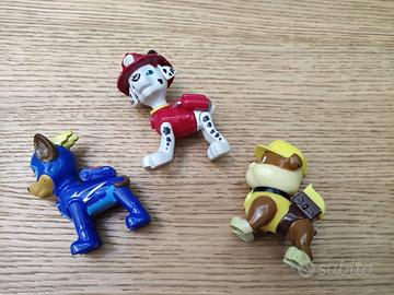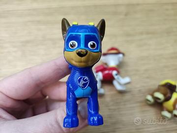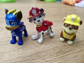 Set di 3 personaggi dei Paw Patrol: - Chase: cucciolo di pastore tedesco, colore blu, è un cane poliziotto - Marshall: cucciolo di dalmata, colore rosso, è un cane pompiere da salvataggio - Rubble: cucciolo di bulldog inglese, di colore giallo, è un cane scavatore