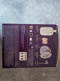 Cappuccio anteriore, Membrana, Valvola, Coppa per il seno (21 mm mai usata, 24 mm unica usata), adattatore da 19 mm (perfetto), Coppa di raccolta latte col suo tappo, Gruppo motore (visibile acceso in foto), Clip (rimovibile), Tubo in silicone, Cavo di trasporto rosa, Cavo USB (ancora sigilliato).