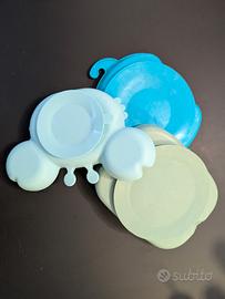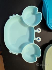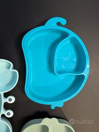 Vendo tre piatti in morbido silicone con ventosa per fissarli alla superficie di appoggio, adatti per la pappa di bimbi 0-3 anni.