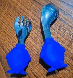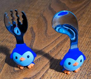 1 coppia di posate formata da 1 forchetta e 1 cucchiaio, con impugnatura a forma di pinguino bianco e blu.