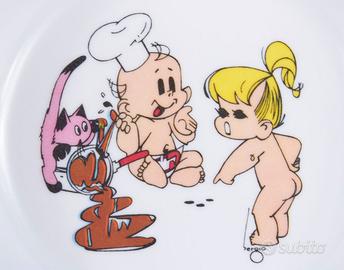✹ Design e grafica — Questo piatto è caratterizzato da disegni retro attribuiti a Sergio Frigerio (anche se la documentazione sul suo coinvolgimento diretto nei prodotti Chicco è rara, alcune inserzioni e testimonianze vintage indicano la sua firma grafica su piatti scaldavivande di quell’epoca).