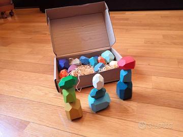 Le pietre di equilibrio impilabili in legno sono un originale set di pezzi di legno a forma di pietre di diversi colori e dimensioni.