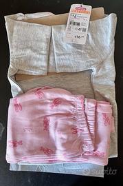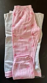 Casual pigiama due pezzi da bambina. Il capo si compone di maglia a maniche lunghe su base grigio chiaro con dettagli rosa, pantalone su base rosa con stampa coordinata ed elastico in girovita.