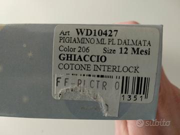 Pigiamino bianco azzurro della carica dei 101 con un dalmata in primo piano. Realizzato in cotone interlock, taglia 12 mesi. Maglia a manica lunga e pantalone coordinato, come da foto. Mai utilizzato e in scatola originale.