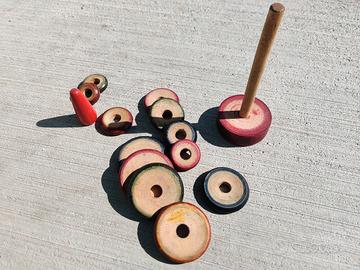 Vendo gioco vintage in legno, piramide composta da cerchi in legno di diverso diametro da inserire nel corretto ordine sul perno.