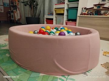 Piscina di palline rivestita di tessuto, completamente sfoderabile. Abbiamo aggiunto alcune palline rispetto a quelle già incluse nella piscina all'acquisto.