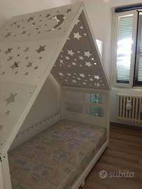 - letto singolo design unico in stile Montessori a casetta luna e stelle, lavorazione artigianale, tutto in legno, solo un anno di utilizzo. La recinzione laterale funziona anche come sponda letto per bambini molto piccoli, mentre le dimensioni del letto lo rendono fruibile anche da un adulto. Le dimensioni sono: 204 cm (lunghezza) x 98 cm x 201 cm (altezza massima). Adatto per materasso 90 x 200 cm.