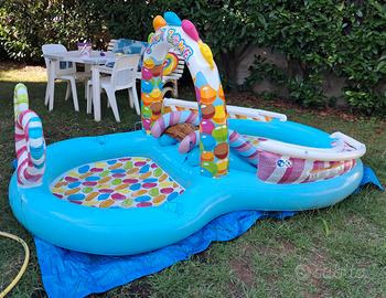 La piscinetta lato scivolo tende a svuotarsi lentamente a causa della presenza di un taglietto sul fondo in prossimità dell'attaccatura laterale dello scivolo. L'altra piscinetta è perfettamente funzionante. Per chi sa ripararlo, la piscina è complessivamente in ottime condizioni ed utilizzabile ancora per molto. Spedizione disponibile da concordare o ritiro a mano Roma o Gaeta.