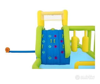 Contenuto: 1 scivolo, 1 compressore d'aria, 1 kit riparazione (con toppe assortite), 1 borsa per il trasporto, pioli di ancoraggio, 1 pallone fontana in PVC, 6 bandierine, 1 manichetta per l'acqua.