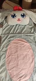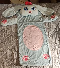 Morbido pisolone a forma di coniglio, perfetto per i più piccoli. Realizzato in peluche azzurro, è dotato di grandi orecchie e un simpatico fiocco rosso.