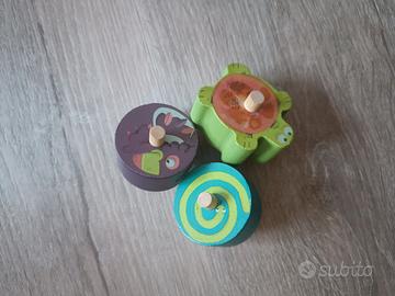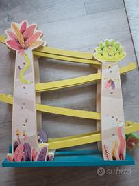 Pista a cascata di legno Moulin Roty, ottime condizioni, con 3 trottole (serpente, tartaruga e tucano). Come da foto