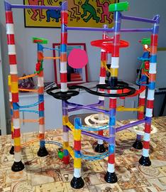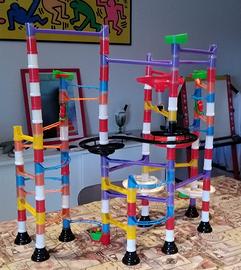 Stupenda pista per biglie Quercetti. Creare la tua pista con rotaie, ponti, colonne, mulinelli, doppie spirali è veramente divertente. Contiene 2 alternatori di percorso che fanno compiere alle biglie discese sempre diverse. Creatività e ragionamento fanno costruire piste belle e funzionanti. Completa di 24 biglie come da foto.