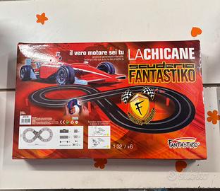 Vendo pista da corsa acrobatica "La Chicane" della Scuderia Fantastiko, scala 1:32. La particolarità di questo gioco è che funziona senza pile o prese di corrente: l'energia per le auto viene generata manualmente tramite appositi controller a manovella.