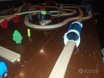 Pista in legno di svariati metri comprensiva di tunnel luminosi, ponti, macchinine attacco magnetico , a batterie e telecomando. costo d'acquisto nuovo circa 250 euro.