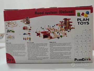 Pista in legno PlanCity della Plan Toys con istruzioni. Ottimo gioco; legno resistente. Sono presenti i due lampioni gialli e uno dei tre alberelli.