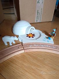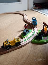 19 pezzi di pista in legno, alcuni accessori e personaggi come in foto. in aggiunta 3 soggetti,ma mancano di un pezzo