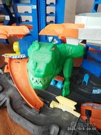 I bambini possono trasportare i veicoli nel montacarichi azionato manualmente su fino all'ultimo piano del garage e farli correre giù cercando di evitare il T-Rex meccanico che vuole divorarli!