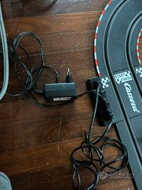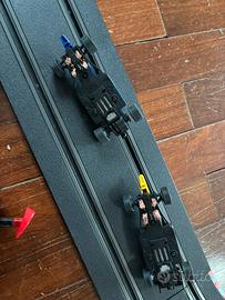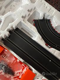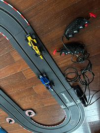 Pista da montare su cui far correre due macchinine. In vendita per essere ancora utilizzata come gioco, oppure per collezionismo. Le spazzole metalliche originali che fanno da contatto con la pista si sono consumate. Le ho sostituite con dei fili di rame (probabilmente dureranno molto di piu). Al momento le macchine sono entrambe funzionanti, ma con lutilizzo puo essere necessario “regolare” le spazzole metalliche facendo in modo che tutte e quattro tocchino terra. La macchina gialla è un po piu lenta a causa di un attrito che non capisco da dove si genera, ma è compensabile con il tasto del turbo sul telecomando (da usare moderatamente in curva).