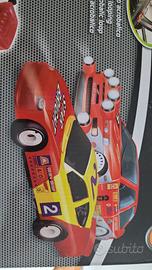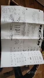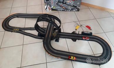 Pista Speed Gear lunghezza totale pista 695 cm. Traguardo con contagiri, doppia sopraelevata e doppio loop acrobatico. Due auto con luci incluse, funziona con batterie LR 14.Come nuova, adoperata solo una volta ancora con scatola originale.