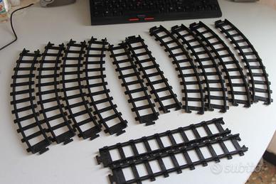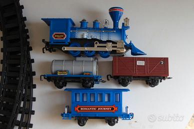 Trenino con vagoni e rotaie in plastica. Ha effetti di luce e suoni, funziona a pile ed e' incluso un suo tracciato con rotaie, sono in totale circa 16 pezzi tra tracciato e vagoni/locomotiva. La locomotiva per funzionare necessita di batterie non incluse. Oggetto per bambini di semplice fattura ma simpatico. Condizioni come da foto, visto e piaciuto.