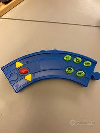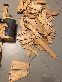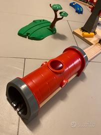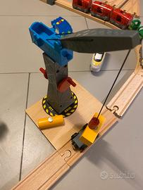 Pista Treno brio, composto da molti moduli. Uno dei due treni bianchi che vedete in foto, è dotato di telecomando con luci e suoni. Contiene inoltre uan stazione, una galleria, una gru con trenino trasporto mattoncino gialll con calamite, un albero e tutto quello nelle foto. Condizioni ottime