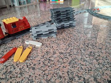 Pista del treno Lego Duplo con due Locomotive elettriche, di cui una con riconoscimento dei segnali. Ponte + due scambi + passaggio a livello. Due carrozze per i passeggeri e omino capotreno. Tutto in ottimo stato anche se usato. Ottimo affare per iniziare con il mondo Lego. Essendo lego originale tutti i pezzi sono garantiti a vita, la pista è composta da due set uno più vecchio e uno più recente.