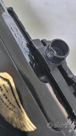 classica Condor, pistola aria compressa con scatola gommini. un regalo senza tempo. mai usata 2 piccole imperfezioni, manico leggermente aperto (la fotografia lo rende fin troppo evidente, in realtà non si percepisce nemneno tenendola in mano) e mirino con una micro ammaccatura piccolissima. tutto visibile in foto. guarnizione della canna perfetta.