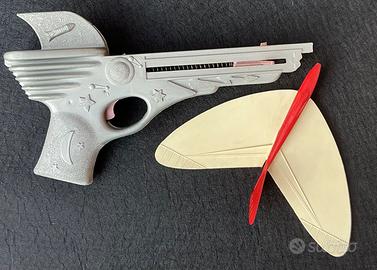 Pistola space age anni 50/60 spara aereoplanino in plastica a molla, si tira indietro la leva rossa e si arma, poi l’aero si infila dentro fino in fondo e si schiaccia il grilletto facendo così partire l’aereo…la trovo fantastica per chi ama questi giocattoli space age….misura lg. 30cm. H. 17 cm. Visto e piaciuto, spedizione a vostro carico ritiro a mano a Parabiago