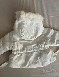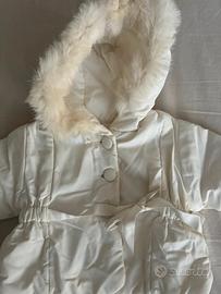Colore bianco, con cappuccio rifinito in *vera pelliccia*, cinturina in vita e chiusura con bottoni rivestiti in stoffa.
