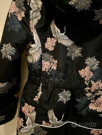 Bellissimo piumino per bambina, stile giapponese con decorazioni a fiore, elastico in vita. Cappuccio staccabile, colore blu con decorazioni rosa. Come nuovo, mai indossato. Taglia 10 anni.