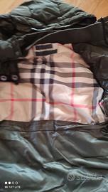 Piumino Burberry bambino/a originale junior 5 anni/108cm ,con cappuccio rimovibile , tasche, colore verde oliva , chiusura frontale con zip e bottoni, ;design trapuntato , polsini a coste, usato.