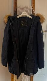 Piumino blu lungo per bambina (poiché sfiancato) con cappuccio dotato di bottoni per poter rimuovere la pelliccia sintetica.