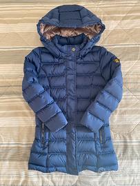 Piumino lungo con cappuccio staccabile per bambina brand Ciesse Piumini in vera piuma d’oca, colore blu/interno rosa opaco, taglia 4 anni(104cm), vestibilità avvitata, chiusura con zip e bottoni, 2 tasche con chiusura zip e tasca interna anch’essa con chiusura zip, classico logo applicato sulla manica sinistra.