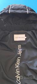 Logo CK ben visibile sia davanti che dietro, chiusura con zip e cappuccio incluso.