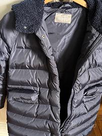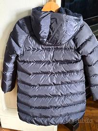 Piumino per bambina di 10 anni de " il Gufo" in perfette condizioni, colore blu scuro, in vera piuma d'oca con cappuccio e un fiore applicato sul lato sinistro,