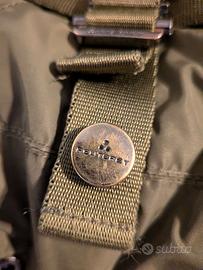 Piumino da bambina di colore verde militare con pelo nel cappuccio. Cappuccio staccabile e doppia allacciatura.
