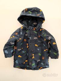 Design: Fantasia "all-over" con animali colorati (scimmie, giraffe, coccodrilli, ippopotami e tartarughe) su sfondo Blu Scuro (Navy). La chiusura è a cerniera lampo (marca YKK) e il fondo manica è elasticizzato internamente per una migliore tenuta del calore.