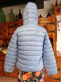 Leggero piumino Benetton per bambina. - Taglia 11 anni. - Colore azzurro. - Con cappuccio. - Chiusura zip. Indossato da manichino donna adulta