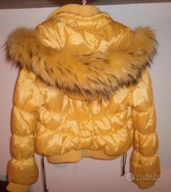 Piumino Monnalisa originale ,cappuccio staccabile con collo di pelliccia vera .Colore giallo Tg 10