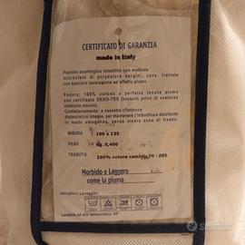 Vendo piumino per culla marca Daunex, in ottimo stato come nuovo. Anallergico e antiacaro, lavabile in lavatrice a 60 gradi. Misure 100x135, peso KG. 0,400.