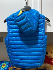 Come nuovo, gilet/piumino smanicato bambino taglia 11-12 anni, colore azzurro/blu chiaro con cappuccio interno giallo, marca piazza Italia