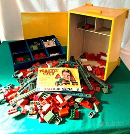 Giocattolo Grande Scatola Legno con oltre 950 pezzi PLASTIC CITY costruzioni Italo Cremona Vintage anni ' 70 1960. La Italo Cremona con Plastic City lancia la sfida allo strapotere della Lego sui mattoncini colorati per le costruzioni in plastica. Grazie ad accordi commerciali con Standa, Rinascente, Upim e attraverso intense campagne pubblicitarie sui giornali per ragazzi e sulla televisione, la Italo Cremona, negli anni del boom economico riuscì ad insidiare, seppur in maniera molto marginale, il mercato della danese Lego. Quest’ultima, fondata nel 1932, dominava, infatti, il settore della produzione dei celebri mattoncini dal 1949. Questa e’ una grande scatola di legno dedicata a raccogliere oltre 950 pezzi in plastica della PLASTIC CITY Italo Cremona anni 70, il gioco di costruzioni con mattoncini in plastica della nostra infanzia. La scatola laccata e’ tutta in legno massello, provvista di 4 piedi , con coperchio, ha 3 grandi scomparti e manici in legno laterali; il vano superiore anch’esso in legno laccato blu e’ asportabile ed ha 6 scomparti. Si trova ancora in buonissime condizioni con minimi segni d’ uso e del tempo, bella la patina del tempo della laccatura e bello il colore. E’ presente il manuale - catalogo Plastic City dell’ Epoca in buone condizioni,con scritte a biro e pieghe, completo con pagine 32 Presenti oltre 950 pezzi in plastica Plastic City per costruzione, anche pezzi speciali, porte finestre etc. in buone condizioni, pochi pezzi con piccole mancanze, vedi foto Misura dello scatolo: lunghezza cm 41,5 - larghezza cm 31- altezza cm 25,5 Articolo raro - questo articolo è difficile da trovare Spedizione veloce e tracciabile a mezzo Corriere