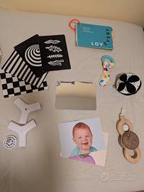 ACCESSORI SOSTENIBILI E ORGANICI: comprende sette accessori (schede ad alto contrasto bianche e nere, palla ad alto contrasto, anello, massaggiagengive, specchi Montessori e un mazzo di schede per l’apprendimento) realizzati con materiali atossici, sicuri per i bambini, tra cui cotone organico e legno sostenibile. Il telaio è realizzato in legno certificato FSC.