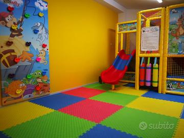 Playground 2 piani come nuovo, interno vasca con palline, piano superiore casetta con percorso e scivolo esterno, parete climbing a muro, staccionata 1,00x 1,00 e cancelletto staccionata 1,00x1,00. 3 tavoli e 6 panche , biliardino mundial a gettone, sabbiera con 4 sedute materiale adatto all’esterno , macchina zucchero filato fox , trono reale in legno rosso.