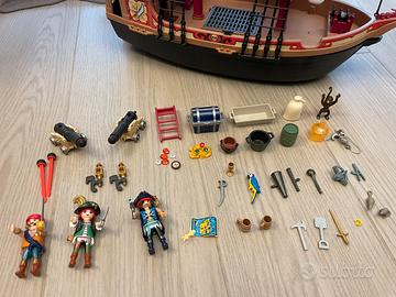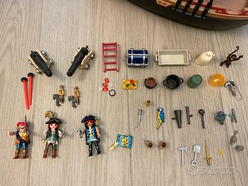 Il set comprende una nave pirata, tre personaggi di PLAYMOBIL, una scimmia, un pappagallo e due topi.