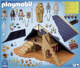Contenuto: 1x PLAYMOBIL History Piramide del Faraone, Set di 98 pezzi con libretto di istruzioni: 1 piramide giocattolo, 1 faraone, 1 ladro di tombe, 1 custode di tombe, 1 mummia, 93 accessori, Materiale: plastica, LxLxA: circa 46 x 37,5 x 27 cm, Peso: circa 1650 g, 5385
