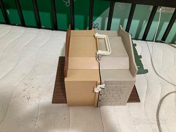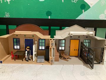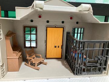 Playmobil portatile rapina alla banca con banca e prigione. La banca è completa mentre nella prigione manca lo sceriffo e i fucili. Manca anche il pezzo su cui si incastra il fermo per chiudere