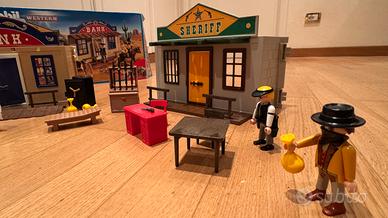 Playmobil western banca e ufficio dello sceriffo quasi completo, mancante 1 solo personaggio, aggiunti due personaggi extra Playmobil sulla sinistra in foto. Scatola in ottime condizioni