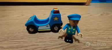 Vendo macchina della polizia + omino e ambulanza + omino come in foto, marca Ibrio per pista treno legno perfettamente funzionanti.